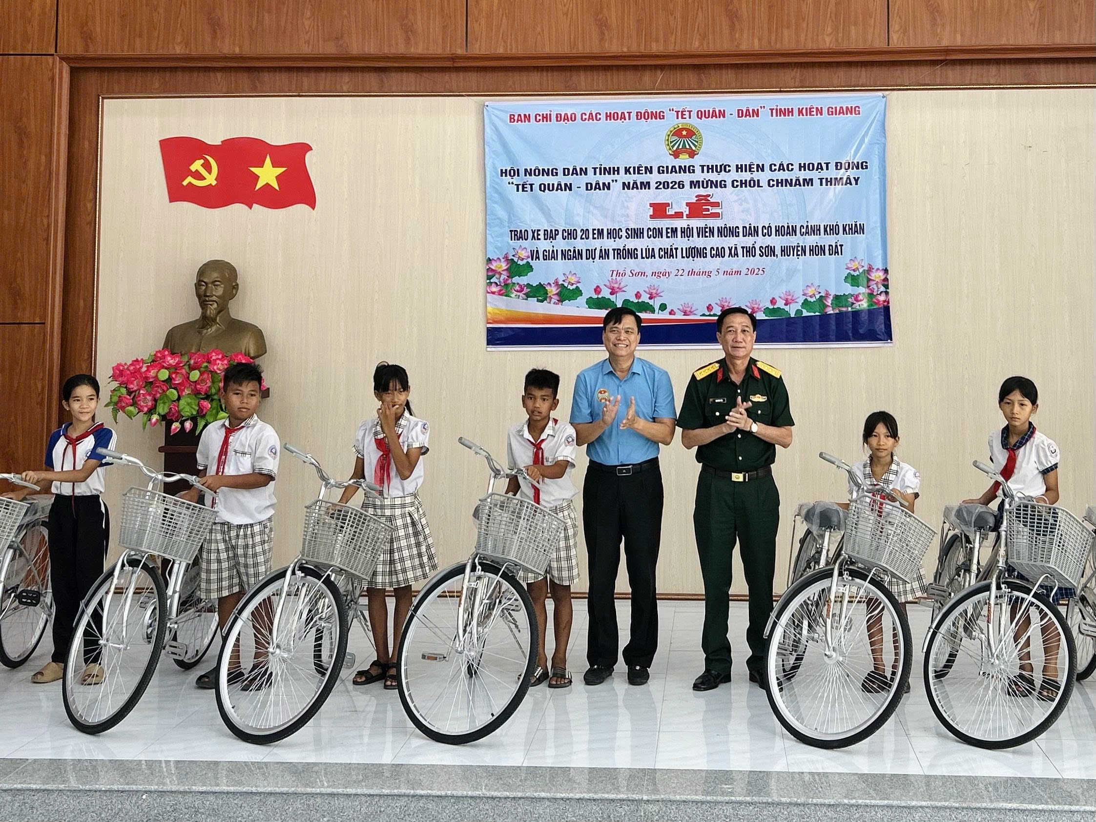 Ông Đỗ Trần Thịnh - Tỉnh ủy viên, Chủ tịch Hội Nông dân tỉnh Kiên Giang; Đại tá Cao Minh Tâm - Phó Chính ủy Bộ Chỉ huy Quân sự tỉnh, Thành viên Ban Chỉ đạo, Phó Trưởng Ban Thường trực Ban Tổ chức các hoạt động Tết Quân - Dân tỉnh trao xe đạp cho các em học sinh