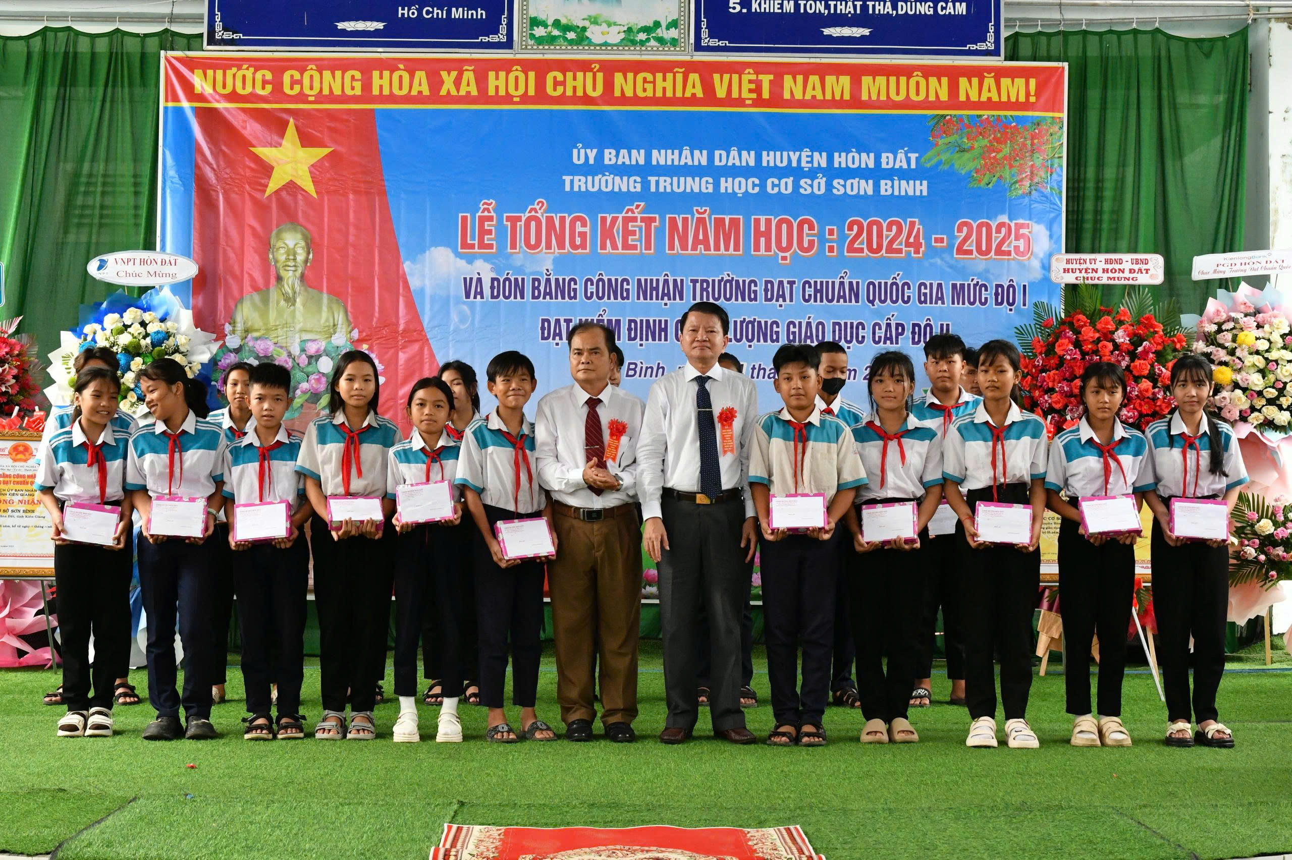 Đồng chí Nguyễn Văn Hoàng - Bí thư Huyện uỷ Hòn Đất và đồng chí Đào Xuân Nha, Phó Chủ tịch Uỷ ban nhân dân huyện Hòn Đất trao tặng 20 suất học bỗng cho học sinh vượt khó học tốt của trường THCS Sơn Bình