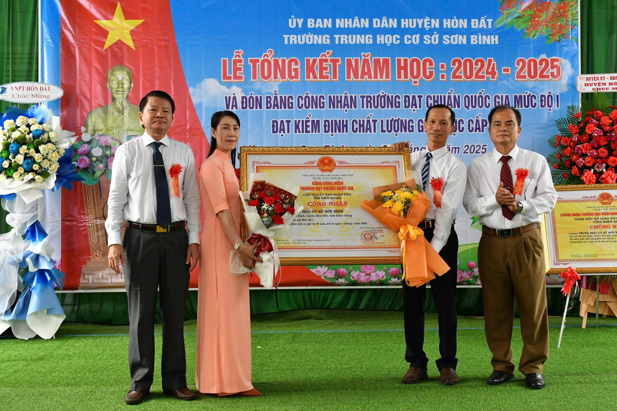 Đồng chí Nguyễn Văn Hoàng - Bí thư Huyện uỷ Hòn Đất và đồng chí Đào Xuân Nha, Phó Chủ tịch Uỷ ban nhân dân huyện Hòn Đất đã trao bằng công nhận đạt chuẩn Quốc gia mức độ 1 cho trường THCS Sơn Bình