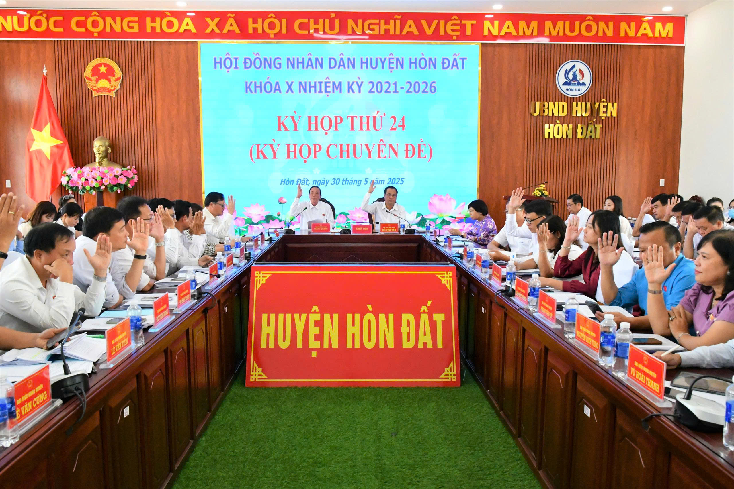 Kỳ họp 24 kỳ họp chuyên đề Hội đồng nhân dân huyện đã lần lượt thông qua các tờ trình về: Dự thảo Nghị quyết điều chỉnh Dự toán thu ngân sách nhà nước trên địa bàn huyện, thu chi ngân sách địa phương năm 2025; Dự thảo Nghị quyết điều chỉnh phân bổ ngân sách địa phương năm 2025; Nghị quyết phê chuẩn quyết toán thu ngân sách nhà nước, thu, chi ngân sách địa phương năm 2024; Nghị quyết điều chỉnh bổ sung kế hoạch danh mục đầu tư công trung hạn, giai đoạn 2021 - 2025 trên địa bàn huyện Hòn Đất; Nghị quyết điều chỉnh, bổ sung kế hoạch danh mục vốn đầu tư công năm 2025; Nghị quyết điều chỉnh, bổ sung kế hoạch danh mục vốn đầu tư xây dựng cơ bản năm 2025; Thông qua điều chỉnh quy hoạch sử dụng đất đến năm 2030 và kế hoạch sử dụng đất năm đầu của điều chỉnh quy hoạch sử dụng đất đến năm 2030 huyện Hòn Đất, tỉnh Kiên Giang; Thông qua tờ trình xin thông qua Nghị quyết về việc giao số người làm việc hưởng lương từ ngân sách nhà nước trong các đơn vị sự nghiệp công lập năm 2025 và số người làm việc hưởng lương từ ngân sách nhà nước bổ sung cho sự nghiệp giáo dục mầm non và phổ thông công lập năm học 2022-2023, 2023-2024, 2024-2025. Cũng tại kỳ họp này, các đại biểu đã biểu quyết thông qua Nghị quyết miễn nhiệm Trưởng Ban Kinh tế - Xã hội HĐND huyện Hòn Đất khoá X, nhiệm kỳ 2021 -2026 và Nghị quyết về việc đề nghị miễn nhiệm Uỷ viên Uỷ ban nhân dân huyện Hòn Đất khoá X, nhiệm kỳ 2021 -2026.