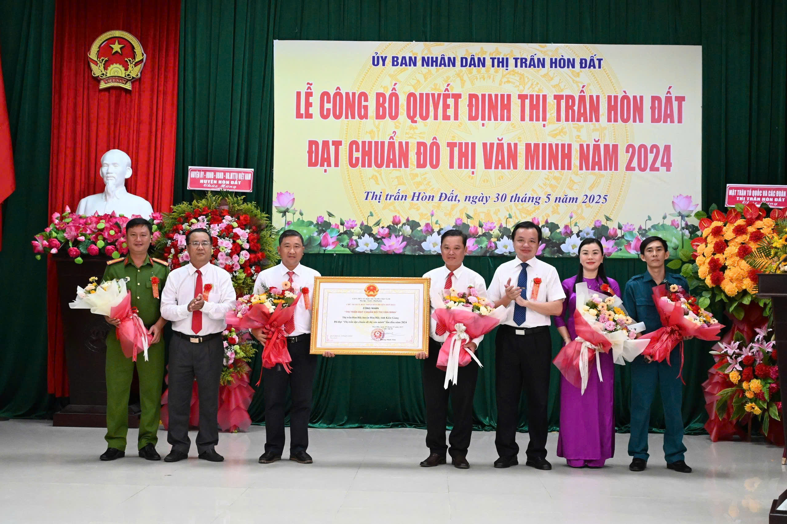 Đồng chí Đỗ Văn Tân - Phó Bí thư Thường trực Huyện uỷ, Chủ tịch HĐND huyện; đồng chí Dương Minh Tâm - Phó Bí thư Huyện ủy, Chủ tịch UBND huyện trao Quyết định công nhận thị trấn Hòn Đất đạt chuẩn đô thị văn minh năm 2024