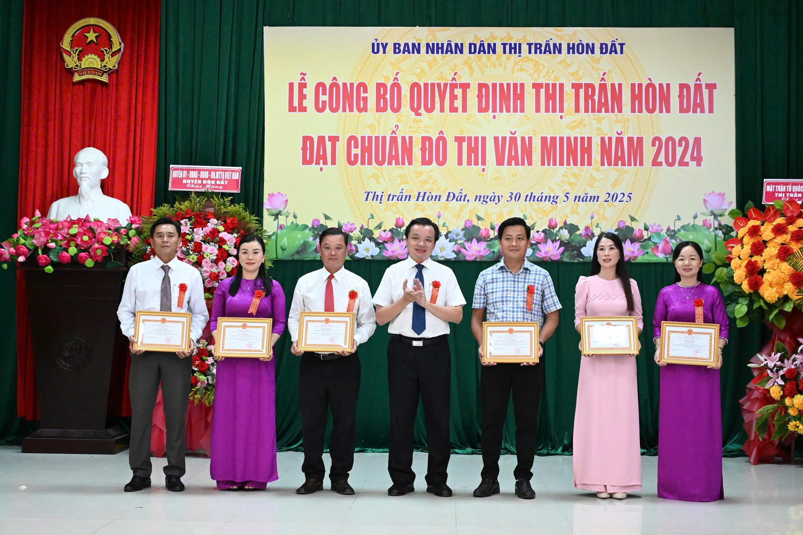 Dịp này, Chủ tịch UBND huyện Hòn Đất tặng giấy khen cho 6 tập thể và 11 cá nhân có thành tích tốt trong phong trào thi đua “Xây dựng đô thị văn minh” giai đoạn 2023-2024; Chủ tịch UBND thị trấn Hòn Đất tặng giấy khen cho các tập thể và cá nhân có thành tích tốt trong phong trào thi đua “Xây dựng đô thị văn minh” giai đoạn 2023-2024./.
