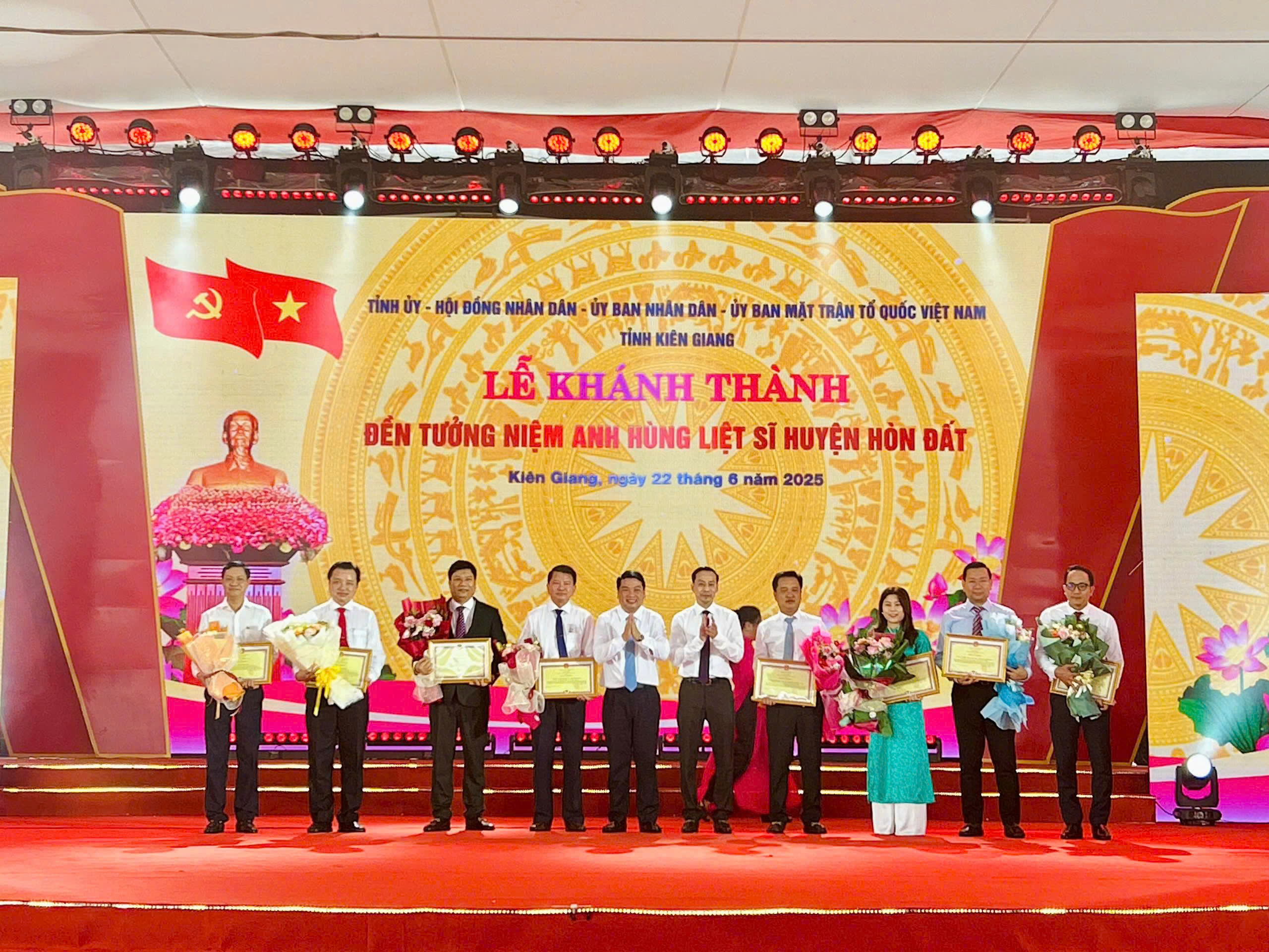 Dịp này, Chủ tịch UBND tỉnh Kiên Giang tặng bằng khen 10 cá nhân và 6 tập thể có thành tích xuất sắc đột xuất đóng góp kinh phí và vận động đóng góp kinh phí thực hiện công trình cải tạo, nâng cấp, chỉnh trang và xây dựng Đền tưởng niệm Anh hùng liệt sĩ huyện Hòn Đất.