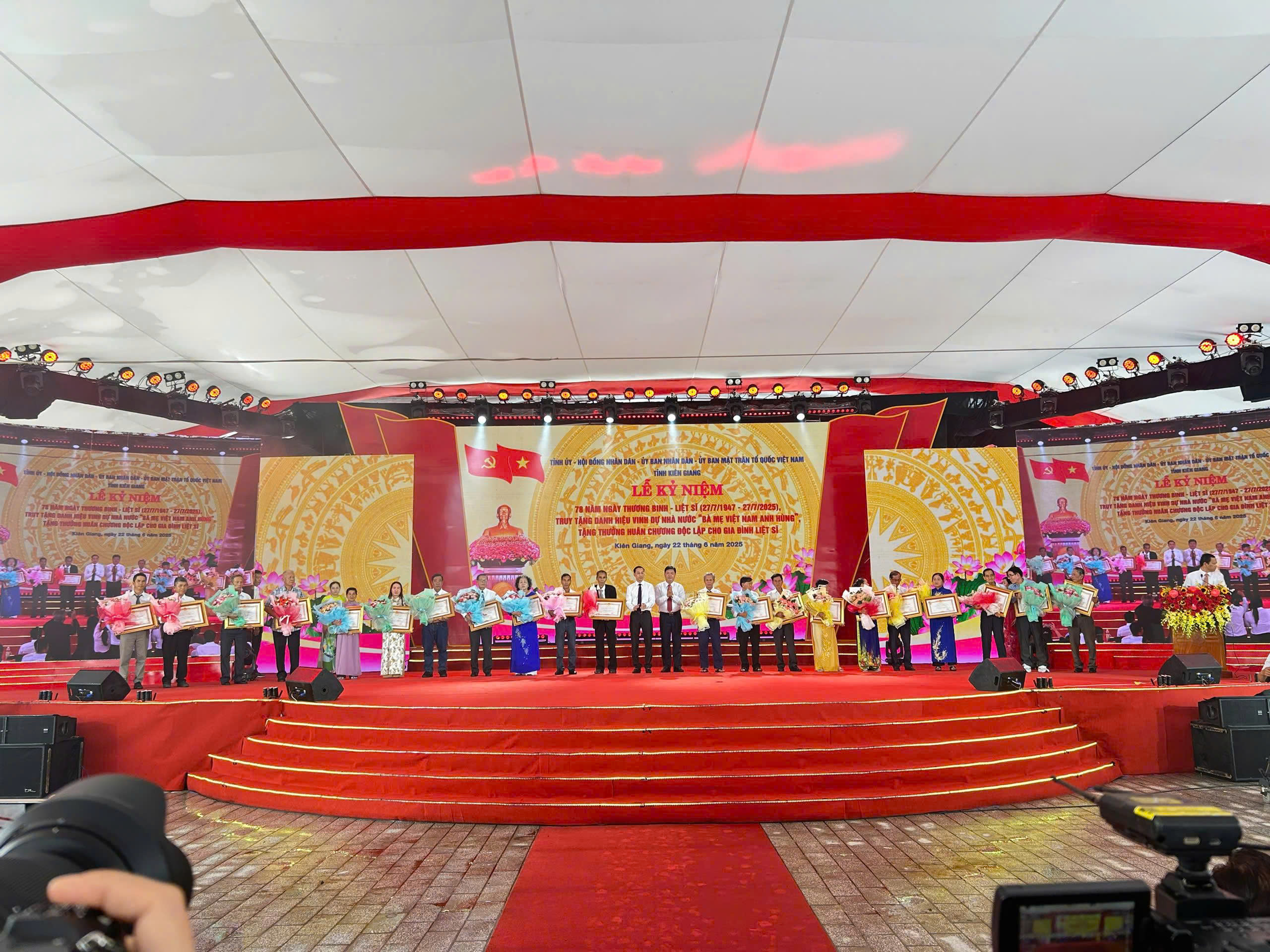 Thừa ủy quyền của Chủ tịch nước, Bí thư Tỉnh ủy Kiên Giang Nguyễn Tiến Hải và Chủ tịch UBND tỉnh Kiên Giang Nguyễn Thanh Nhàn đã trao bằng chứng nhận cho thân nhân của 21 mẹ được truy tặng danh hiệu vinh dự Nhà nước “Bà mẹ Việt Nam anh hùng” đã có nhiều cống hiến, hy sinh vì sự nghiệp giải phóng dân tộc, xây dựng và bảo vệ Tổ quốc; tặng Huân chương Độc lập hạng Ba của Chủ tịch nước cho 4 gia đình cócon duy nhất là liệt sĩ, hy sinh vì sự nghiệp giải phóng dân tộc và bảo vệ Tổ quốc; tặng Huân chương Độc lập hạng Ba của Chủ tịch nước cho 2 gia đình cónhiều con là liệt sĩ, hy sinh vì sự nghiệp giải phóng dân tộc và bảo vệ Tổ quốc.
